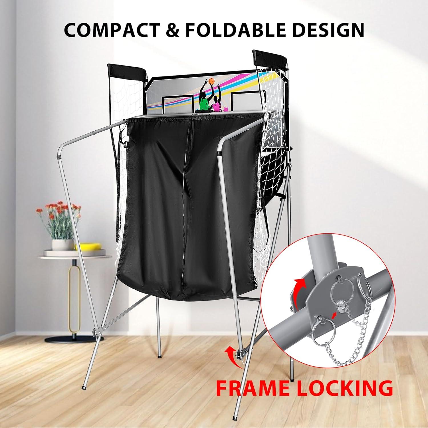 EASY TO STORE – This basketball arcade game adopted a foldable design to help you save space; Folding Size: 34.2″(L) x 42.1″(W) x 81.5″(H); Unfolding Size: 83.5″(L) x 42.1″(W) x 81.5″(H); Note: to prolong the life of the product, it is not recommended to expose the product to bursting sunlight or to rainy weather
