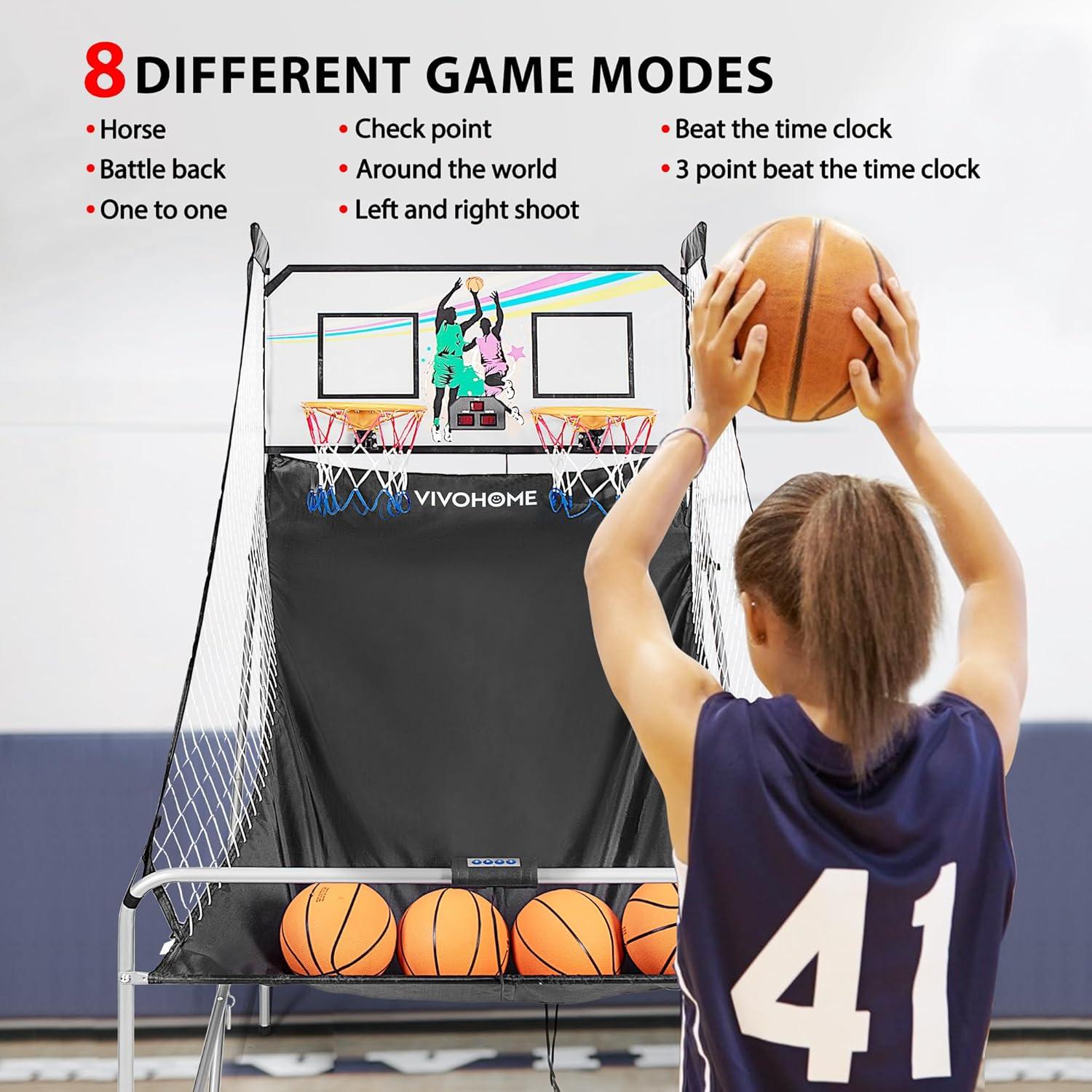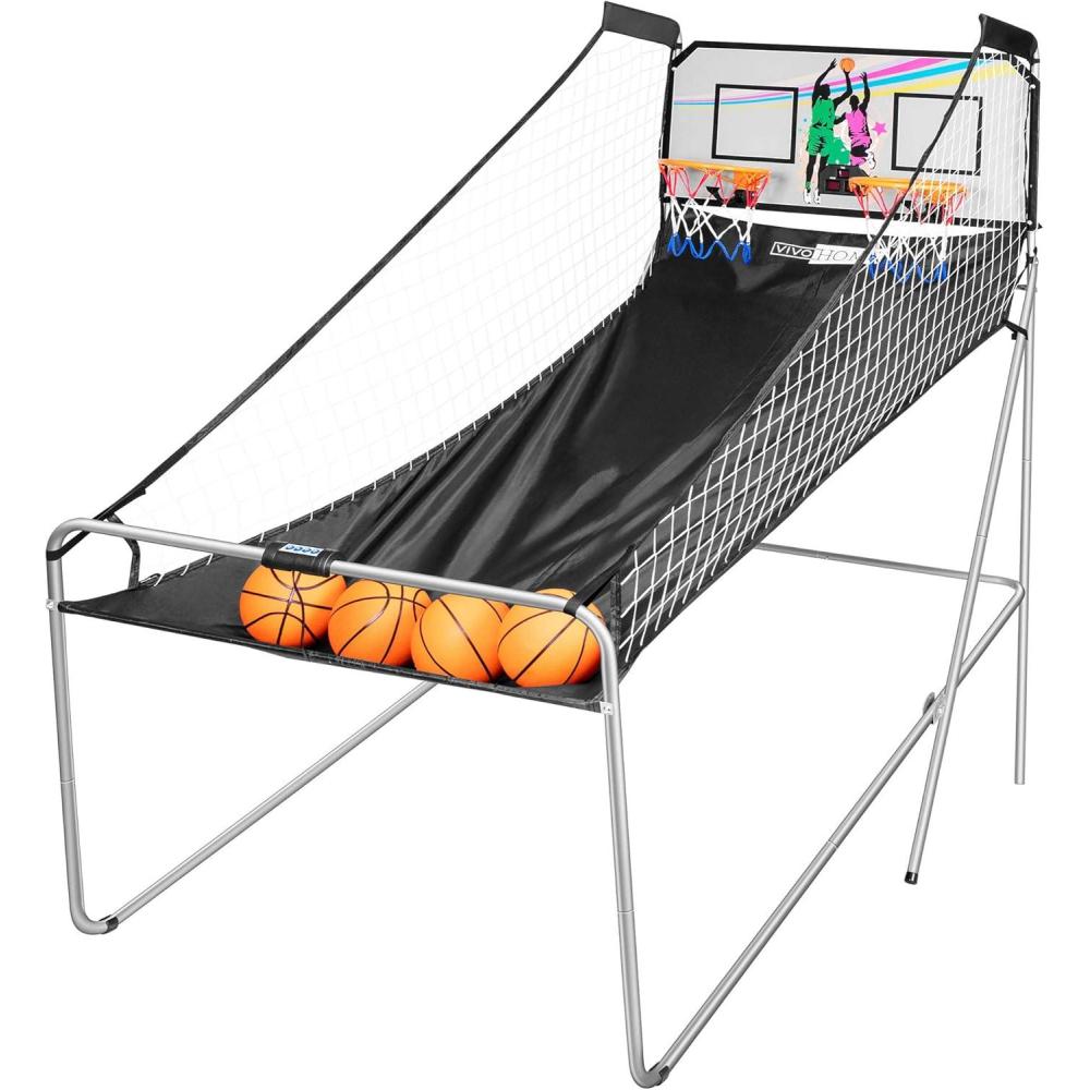 HOME DUAL SHOT – Equipped with 2 basketball hoops and 4 basketballs, the hoop is 12″ in diameter, which is suitable for most basketballs; And the basketball is made of premium rubber material, which is durable and wear-resistance to withstand the impact; It is widely used indoors, such as home, gameroom, basement, gym, and so on